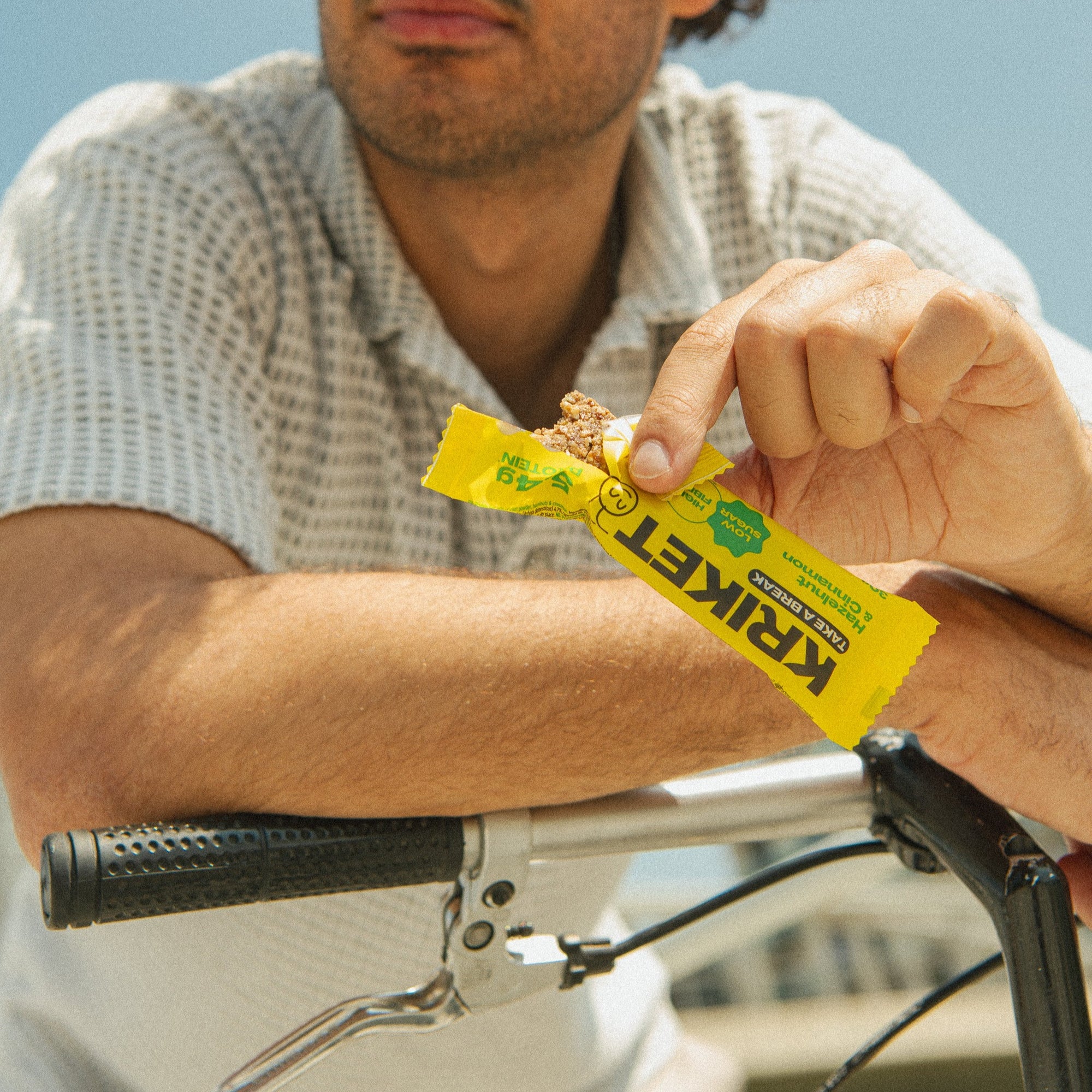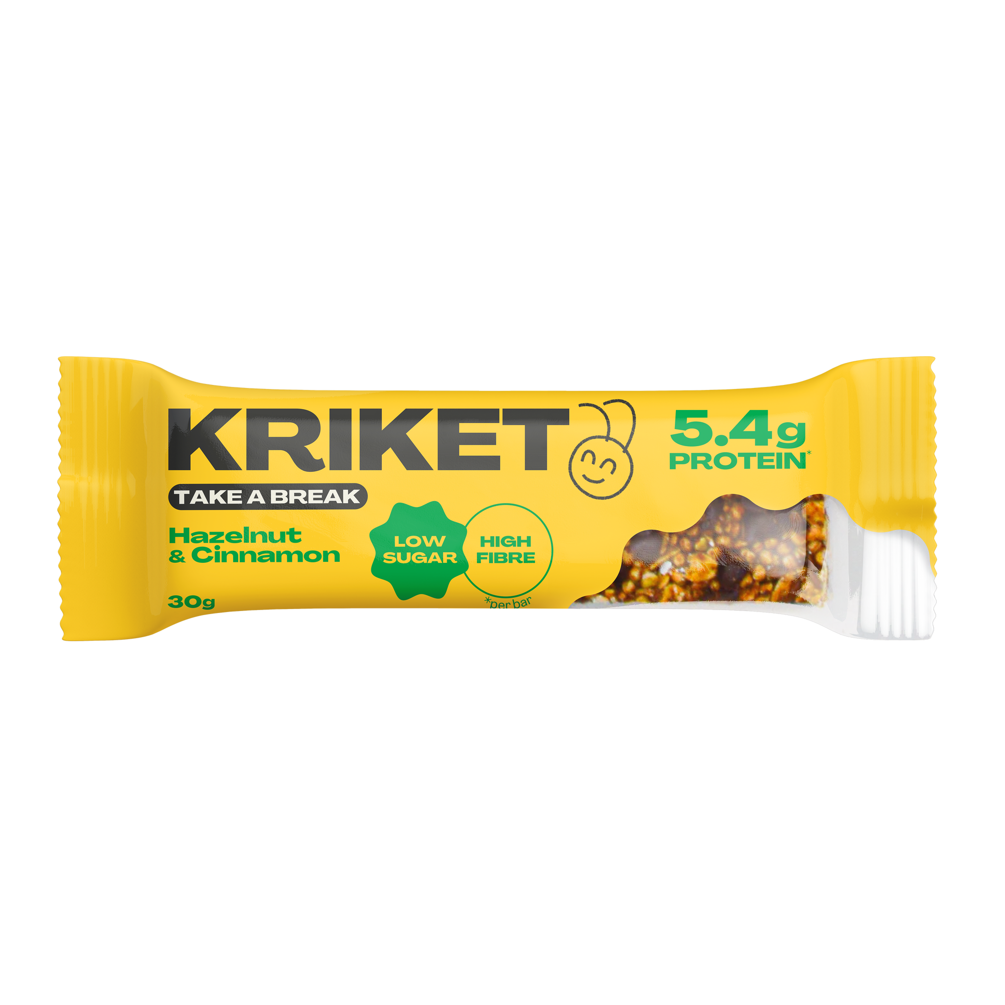 Barre protéinée à la poudre de grillon, noisettes et cannelle. Ingrédients : Muesli 37% [flocons d'avoine sans gluten, graines de courge, graines de lin concassées, sarrasin soufflé, extrudés de protéines de soja (protéines de soja, amidon de tapioca, sel)], oligofructose, noisettes torréfiées concassées 20%, poudre de grillon (Acheta domesticus) 4,7%, huile de colza, cannelle 0,9%, arôme, émulsifiant (lécithines), sel. Les personnes allergiques aux crustacés et/ou aux acariens peuvent également être allergiques aux grillons. Peut contenir du lait, des arachides et d'autres fruits à coque. Date limite de consommation : voir emballage (13 mois à partir de la date de production).