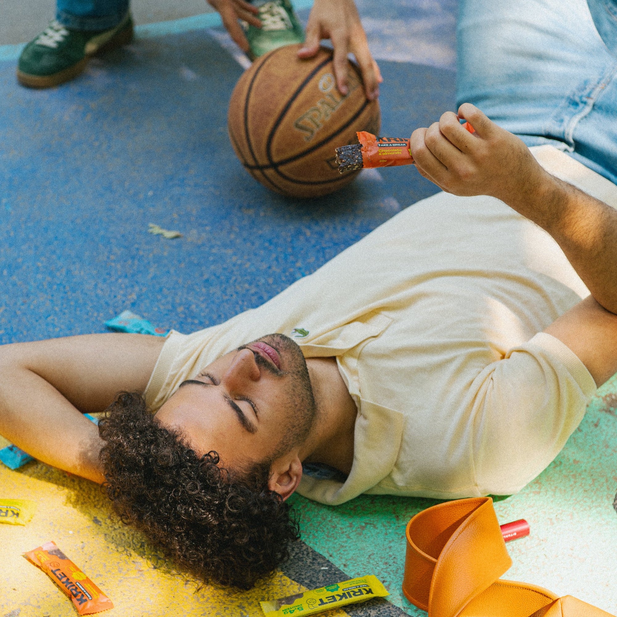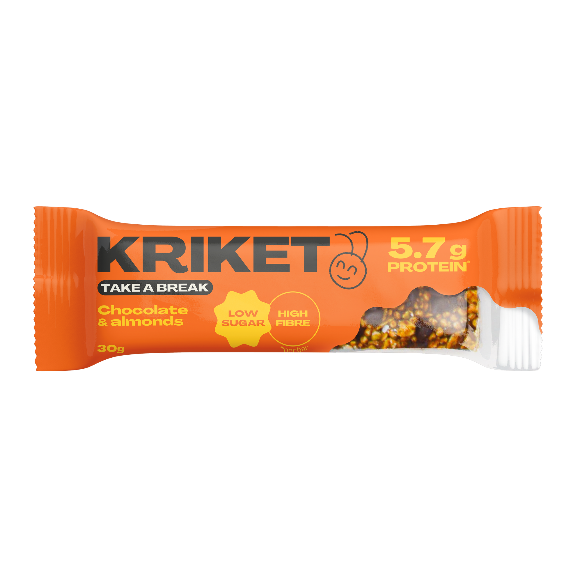 Barre protéinée à la poudre de grillon, chocolat & amandes. Ingrédients : Muesli 46% [amandes concassées 17%, flocons d'avoine sans gluten, extrudés de protéines de soja (protéines de soja, amidon de tapioca, sel), sarrasin soufflé, graines de lin concassées)], oligofructose, amandes, poudre de grillon (Acheta domesticus) 4,8%, cacahuètes grillées, poudre de cacao dégraissée 3,8% [(poudre de cacao dégraissée, régulateur d'acidité (carbonates de potassium)], huile de colza, arôme, sel, émulsifiant (lécithines). Peut contenir du lait et d'autres fruits à coque. Les personnes allergiques aux crustacés et/ou aux acariens peuvent également être allergiques aux grillons. Date limite de consommation : voir emballage (13 mois à partir de la date de production).