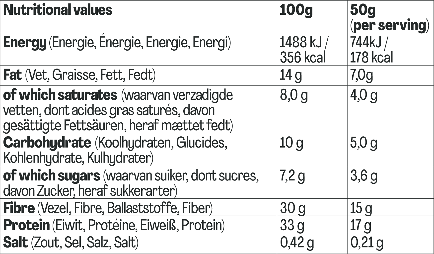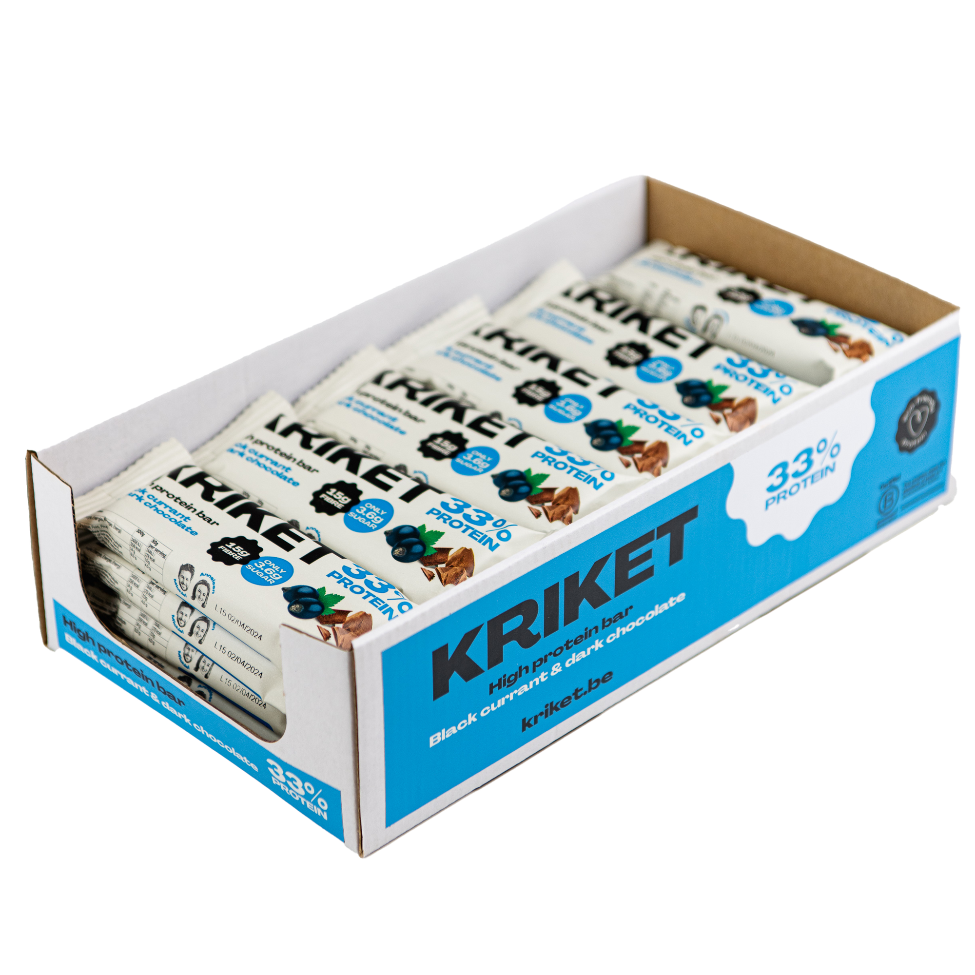 Chicory root fibre, dark chocolate 17% (cocoa mass, sugar, fat reduced cocoa powder, cocoa butter, emulsifiers: soya lecithin, polyglycerol polyricinoleate; extract Bourbon vanilla), soya protein 13%, cricket powder (Acheta domesticus) 13%, rice protein 9,6%, cocoa butter, freeze-dried black currants 3,5%, soya protein extrudates (soya protein, tapioca starch, salt), natural flavourings. Persons who are allergic to crustaceans and/or dust mites may also be allergic to crickets. May contain milk, peanuts and nuts. Best before: see packaging (14 months as of production date).