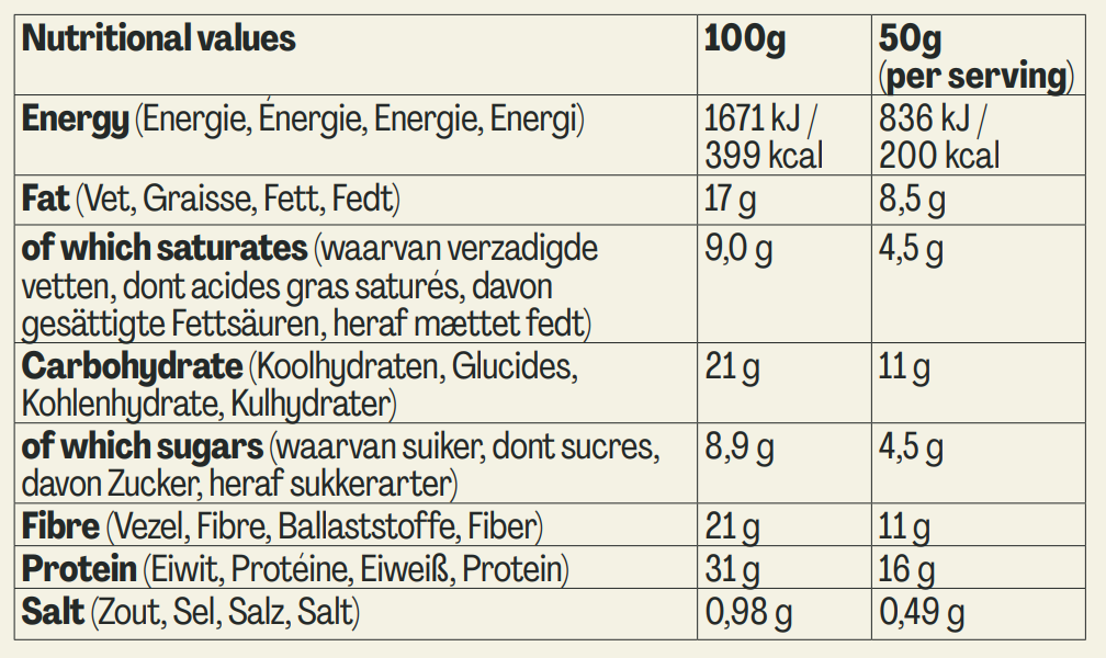 Chicory root fibre, dark chocolate 20% (cocoa mass, sugar, fat reduced cocoa powder, cocoa butter, emulsifiers: soya lecithin, polyglycerol polyricinoleate; extract Bourbon vanilla), cricket powder (Acheta domesticus) 12%, soya protein 9,8%, humectant: glycerol; rice protein 6,9%, soya protein extrudates (soya protein, tapioca starch, salt), cocoa butter, crushed roasted peanuts 2,8%, fat reduced cocoa powder (fat reduced cocoa powder, acidity regulator: potassium carbonates), caramel pieces 2,1% (sugar, glucose syrup, salt), flavourings, salt. May contain milk and nuts. Persons who are allergic to crustaceans and/or dust mites may also be allergic to crickets. Best before: see packaging (14 months as of production date).