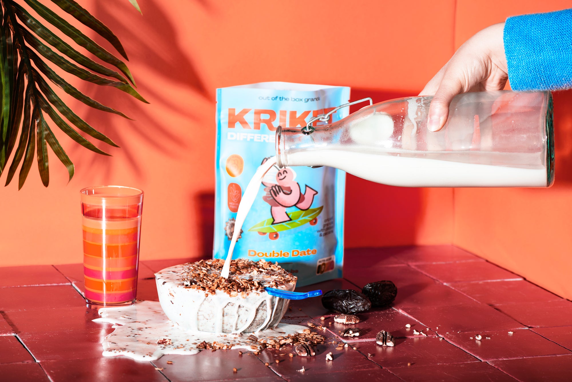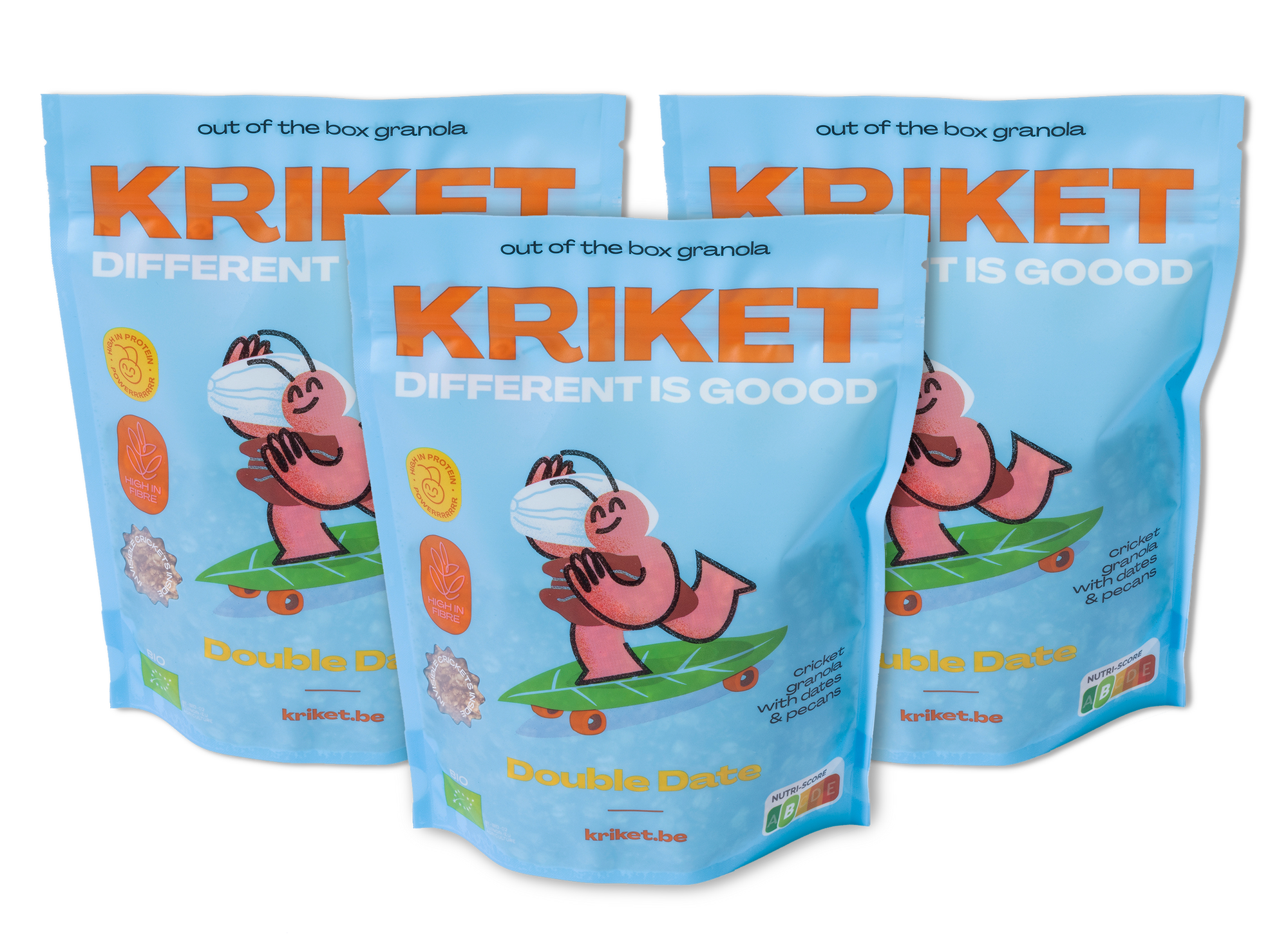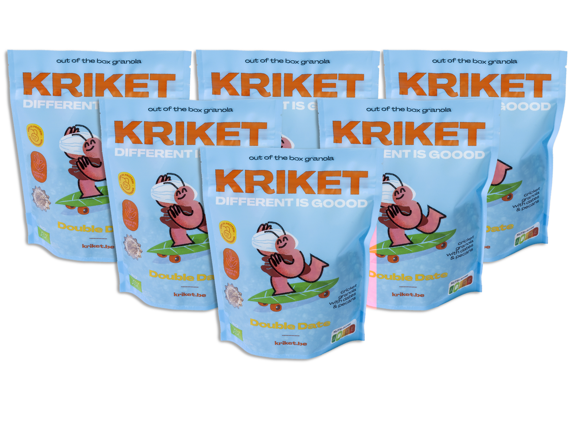 Havervlokken*, dadels* (8%) (dadels*, rijstmeel*), ahornsiroop*, zonnebloemolie*, pecannoten* (6%), agavesiroop*, krekelpoeder Acheta domesticus (5%), quinoa*, zonnebloem-pitten*, lijnzaad*, speculooskruiden* (kaneel*, kruidnagel*, nootmuskaat*, gember*, piment*, korianderzaad*, foelie*, kardemom*), zout. *Van biologische landbouw. Personen die allergisch zijn voor schaaldieren en/of huisstofmijt kunnen ook allergisch zijn voor krekels. Kan sporen bevatten van soja, gluten en pinda’s. Tenminste houdbaar tot: zie verpakking (8 maanden vanaf productiedatum).